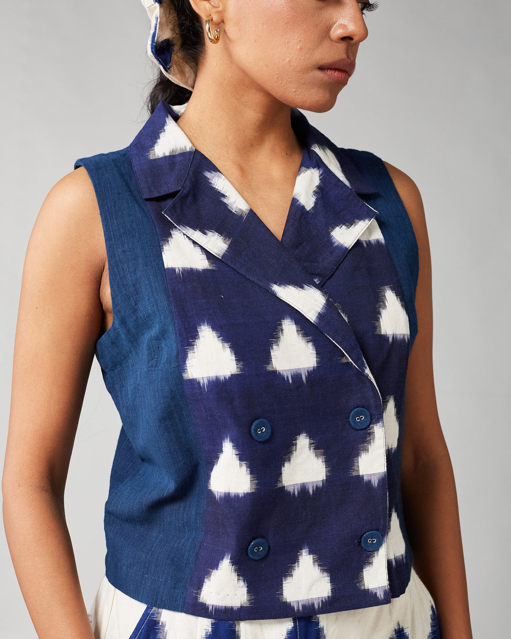Effortlessly transition from day to night with our Indigo Dawn Top, a versatile statement piece crafted from luxurious handwoven fabrics. Designed with a striking triangle V-neck and a tailored sleeveless silhouette, this top flatters effortlessly while offering endless styling possibilities. Wear it solo for a bold, structured look or layer it as a chic waistcoat to elevate any outfit. Breathable, sustainable, and undeniably elegant—this is the wardrobe essential you didn’t know you needed.