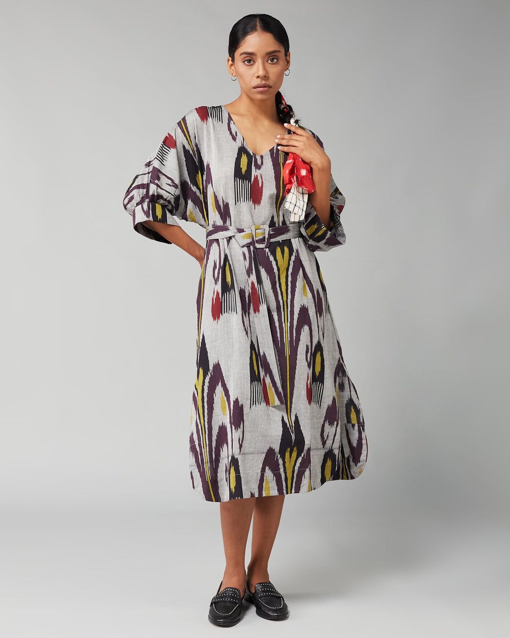 Step into a world of refined elegance with the Abigail Dress, a masterpiece of luxury and craftsmanship. Made from exquisite handwoven Ikat, its flowing silhouette drapes beautifully, while the softly rounded hem adds a touch of femininity. The adjustable tie belt cinches the waist, sculpting a flattering shape that enhances your natural grace. Thoughtfully designed with discreet side pockets, it blends sophistication with everyday ease. Whether styled for a chic daytime look or an elegant evening affair, the Abigail Dress is your go-to for effortless charm and unparalleled comfort. Embrace timeless beauty and make it yours today.