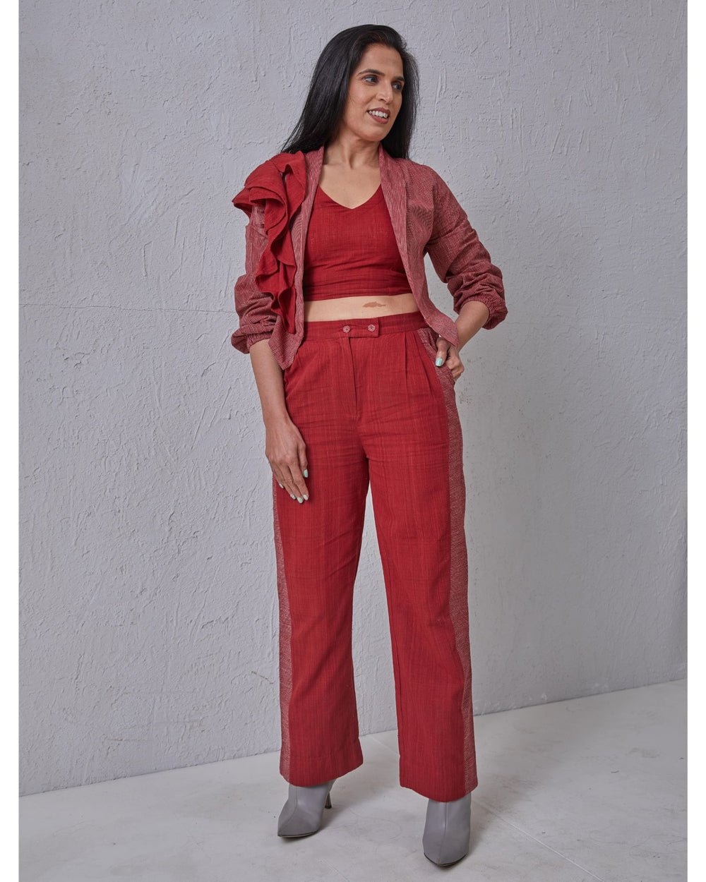 Turn heads effortlessly with the Arani Co-ord Set—a power-packed ensemble designed for the modern woman on the go. Crafted from luxurious handwoven cotton, this bold red set exudes confidence and style from 9 AM to 9 PM. The statement jacket, with its chic frill detailing, adds a playful yet refined touch, while the perfectly tailored trousers ensure all-day comfort with a sleek, flattering fit. Functional pockets make it as practical as it is stylish. Whether you're conquering a workday or stepping out for an evening soirée, the Arani Co-ord Set is your go-to for effortless elegance with a contemporary edge.
