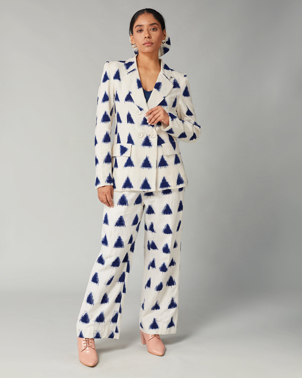 Power dressing meets effortless charm with the Suri Blazer. Crafted from soft, breathable fabric, this double-breasted statement piece blends sophistication with comfort. The bold triangle pattern adds a touch of confidence, while functional pockets bring practicality to your style. Whether you're commanding the boardroom, layering it over a dress for a chic evening look, or pairing it with denim for an elevated casual vibe, this blazer is the ultimate wardrobe essential. Tailored to perfection, it’s a must-have for women who dress with intention.